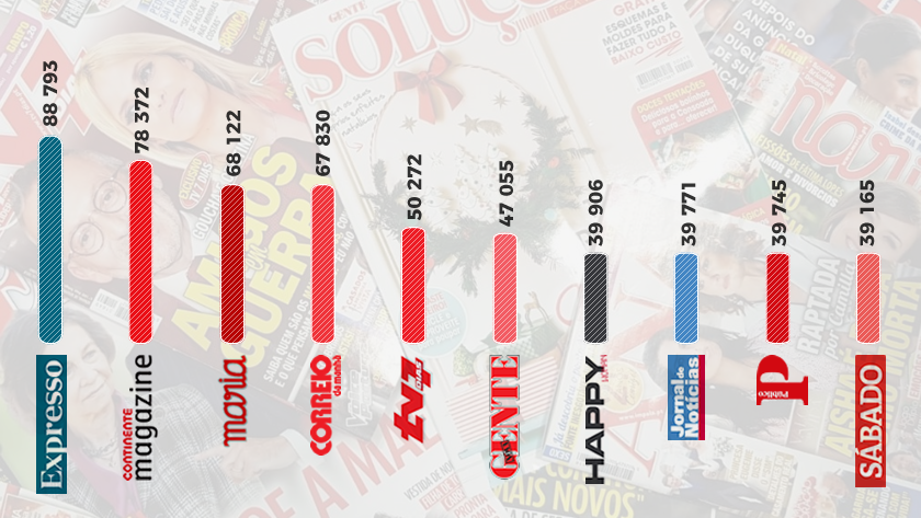 Expresso, Continente Magazine, Maria, Correio da Manhã, Tv 7 Dias, Nova Gente, Happy Woman, Jornal de Notícias, Público e Sábado são as dez publicações, sócias da APCT, com maior circulação total paga, em janeiro, fevereiro e março de 2020.