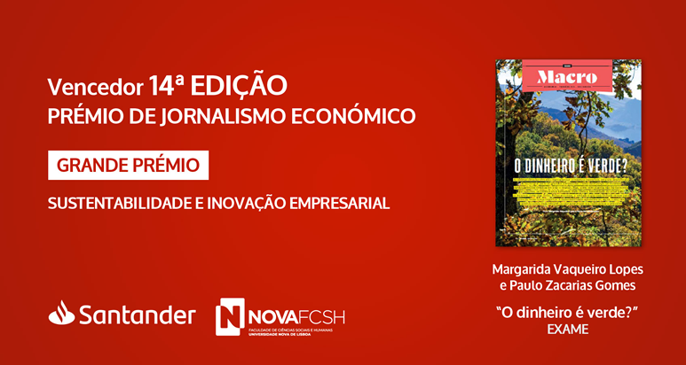 “O Dinheiro é Verde“, dos jornalistas Margarida Vaqueiro Lopes e Paulo Zacarias Gomes, da EXAME, foi o vencedor do Grande Prémio de Jornalismo Económico, na categoria de Sustentabilidade e Inovação Empresarial. Os autores têm direito a um prémio pecuniário no valor de 10.000 euros.